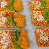 spaghetti dengan saus bolognese yang dilengkapi oleh potongan sosis dan daging cincang serta taburan parutan keju, disajikan dengan chicken katsu. Harga satuan @25.000