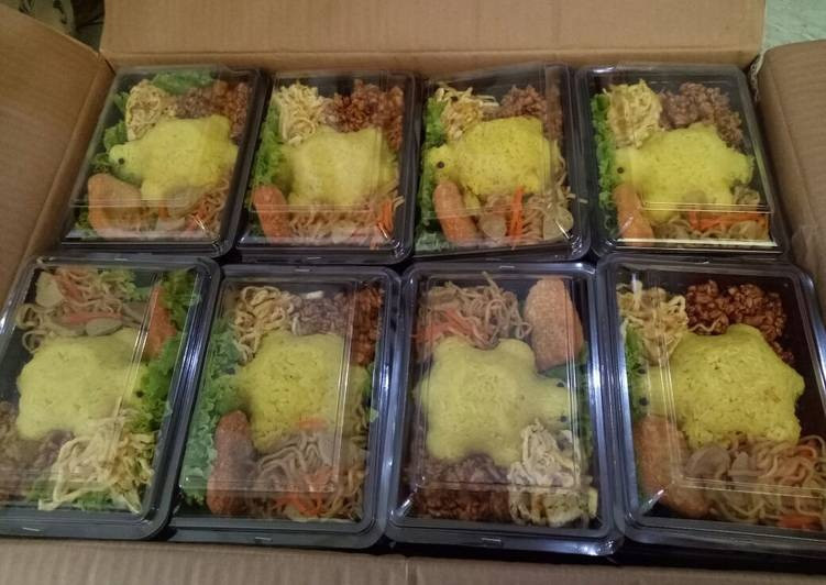 Per Mika Isian: Nasi kuning, Nuget, telur dadar suwir, Mie goreng, tempe Orek.