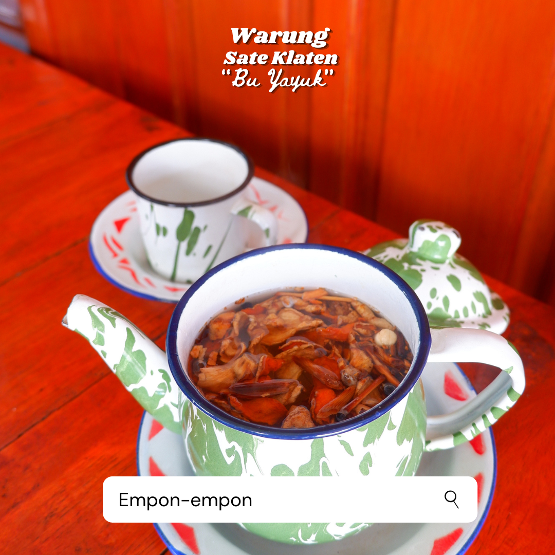 Empon empon terdiri empu : kunyit temulawak, jahe, kencur, serta rempah rempah dilengkapi gula Batu dengan citarasa khas Klaten