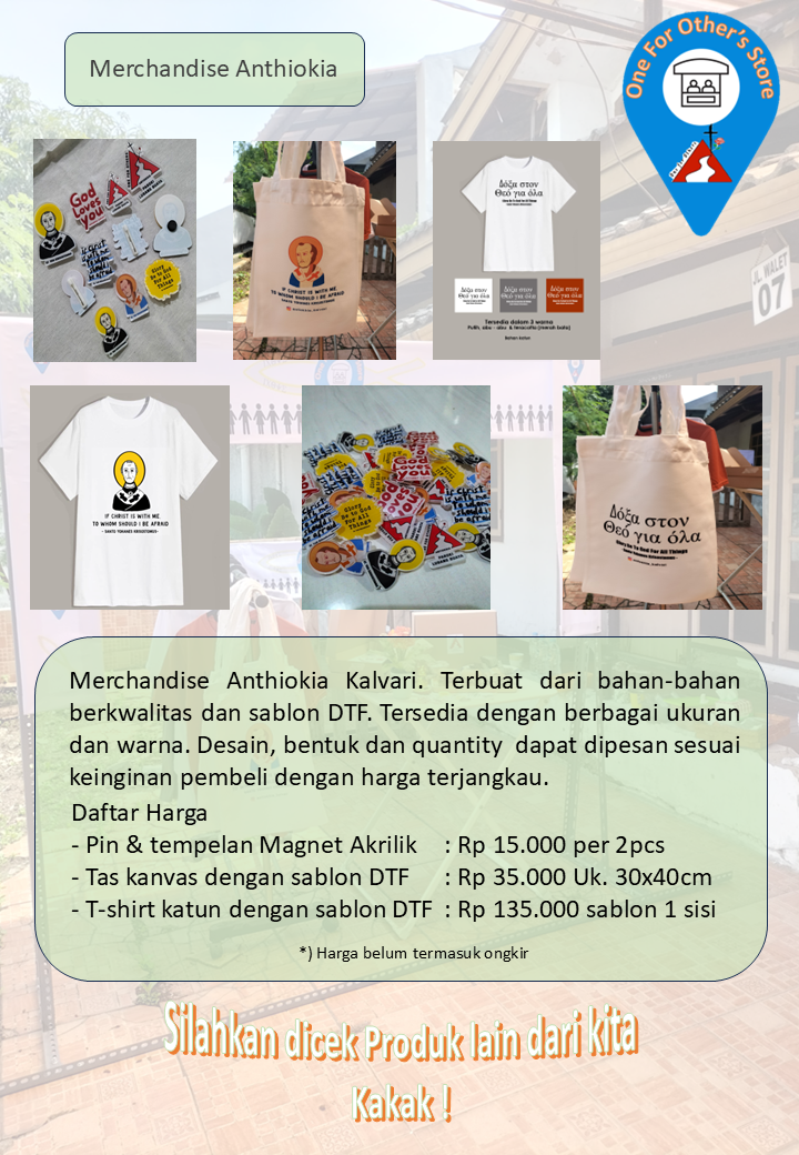 Merchandise Anthiokia Kalvari. Terbuat dari bahan-bahan berkwalitas dan sablon DTF. Tersedia dengan berbagai ukuran dan warna. Desain, bentuk dan quantity dapat dipesan sesuai keinginan pembeli dengan harga terjangkau.