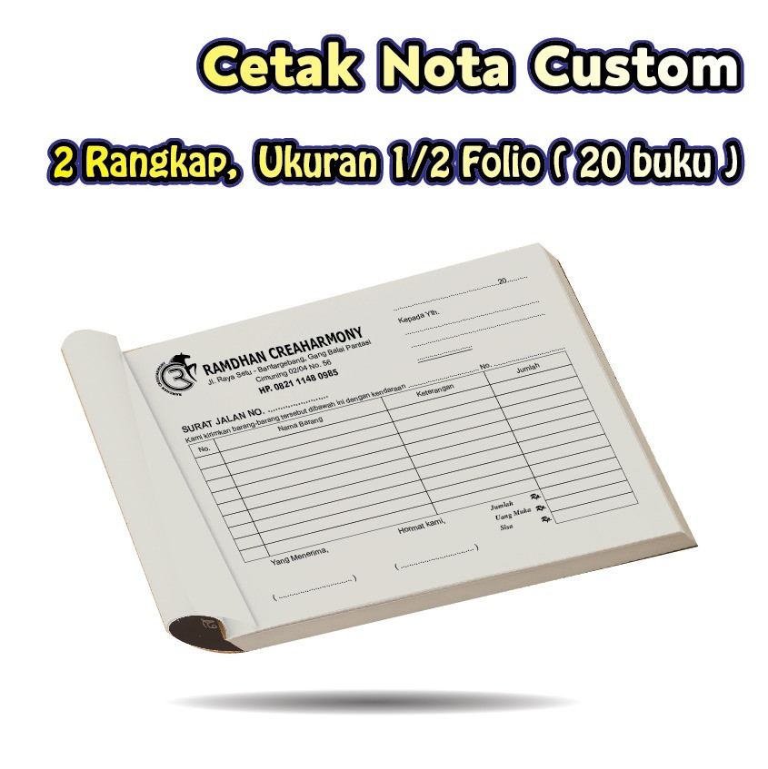 CETAK NOTA Ukuran1/2 folio dapat 20 buku. 2 PLY / RANGKAP , 1 warna tinta cetak SPESIFIKASI : Bahan Kertas : NCR (tembus tanpa karbon dengan Kualitas Baik) Isi : +- 50set ( PUTIH ) ( KUNING ) atau (MERAH) HARGA Tertera Tanpa Nomorator, Tanpa Perforasi, File Ready..