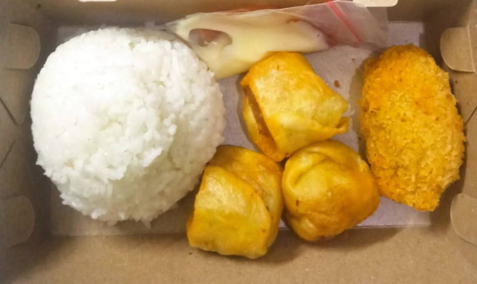 Nasi dengan potongan egg chicken roll dan shrimp roll, dilengkapi dengan saos sambal dan mayonaise