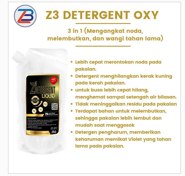 Z3 DETERGENT LIQUID WITH OXY KUALITAS TERBAIK DI KELASNYA 1. Lebih cepat merontokan noda pada pakaian. 2. Menghilangkan kerak kuning pada kerah pakaian. 3. Busa lebih cepat hilang, sehingga dapat menghemat air. 4. Tidak meninggalkan residu pada pakaian. 5. Terdapat bahan untuk melembutkan, sehingga pakaian lebih lembut dan mudah saat di setrika. 6. Dengan , memberikan keharuman memikat yang tahan lama pada pakaian. Z3 adalah Produk Baru segala solusi untuk Kebersihan dan Perawatan Peralatan Rumah Tangga, Pakaian, dan Kendaraan anda, kami siap bersaing dengan kualitas terbaik dan harga yang terjangkau. kami siap menerima saran dari customer untuk mengembangkan produk kami. harapan kami produk kami menjadi unggulan solusi untuk segala Kebersihan dan Perawatan Peralatan Rumah Tangga, Pakaian, dan Kendaraan. Selamat berbelanja :)