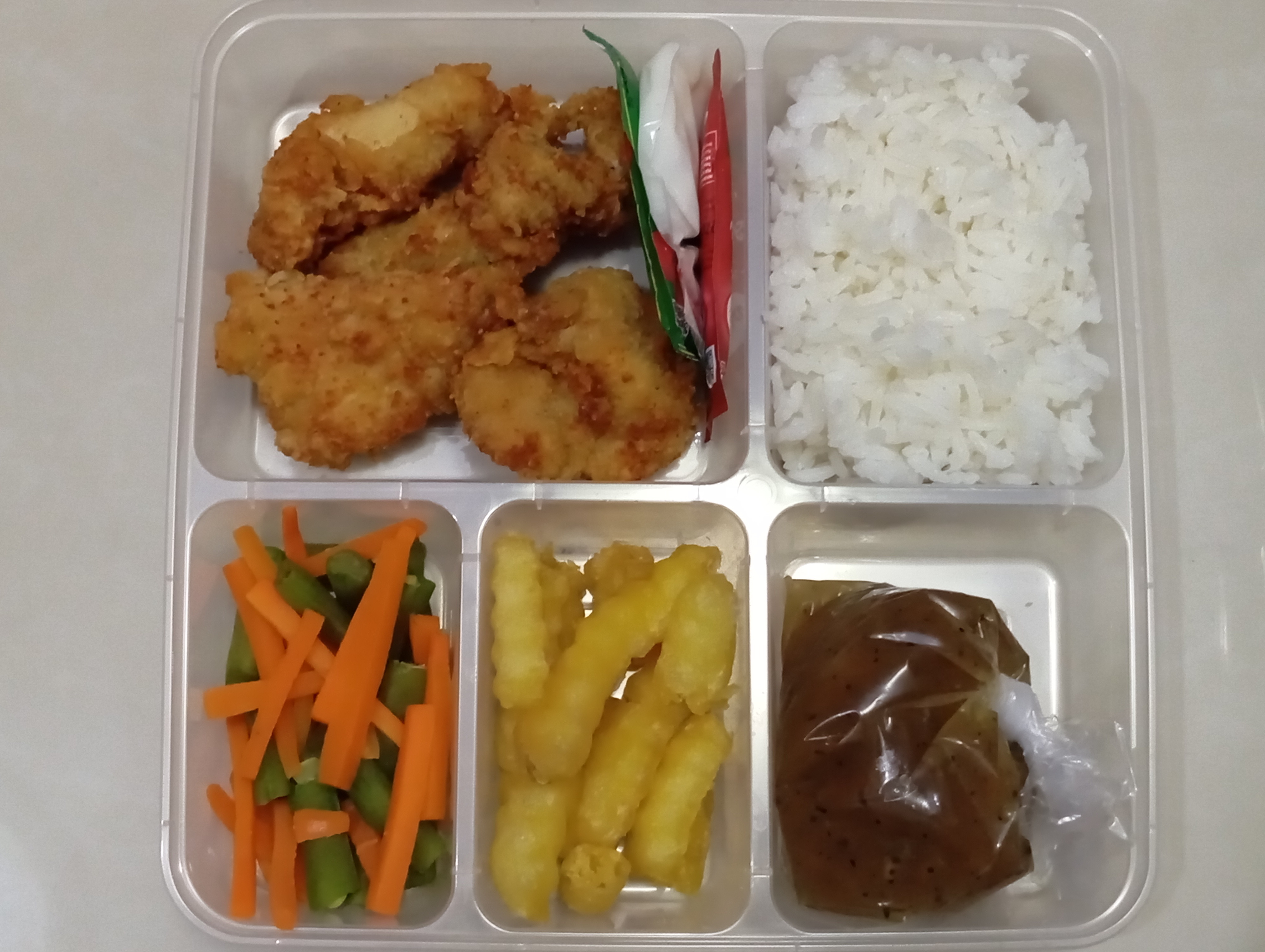 Paduan nasi dengan steak ayam dan kentang goreng, sayur, dan saos barbeque/lada hitam, saos sambal, dan mayonaise