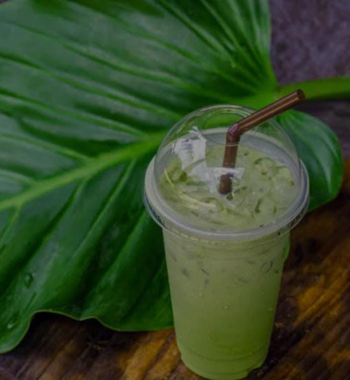 Minuman matcha lengkap dengan es batu yang siap menyegarkan harimu