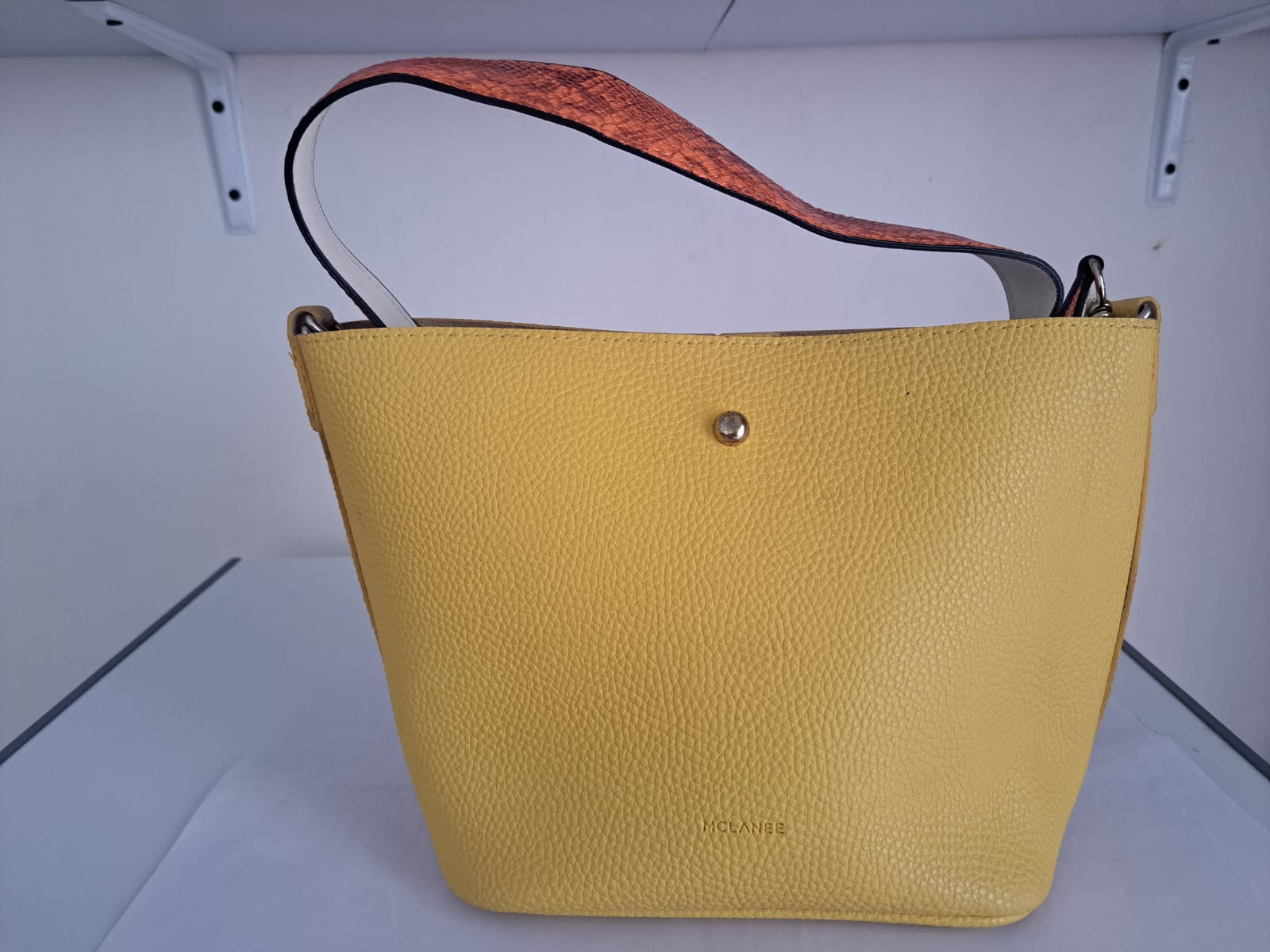 Bahan kulas, talpan bawaan. Minus pemakaian, layak pakai. Warna kuning, 1 kompartemen dengan kancing penutup. PA 30cm, PB 20cm, T 20cm