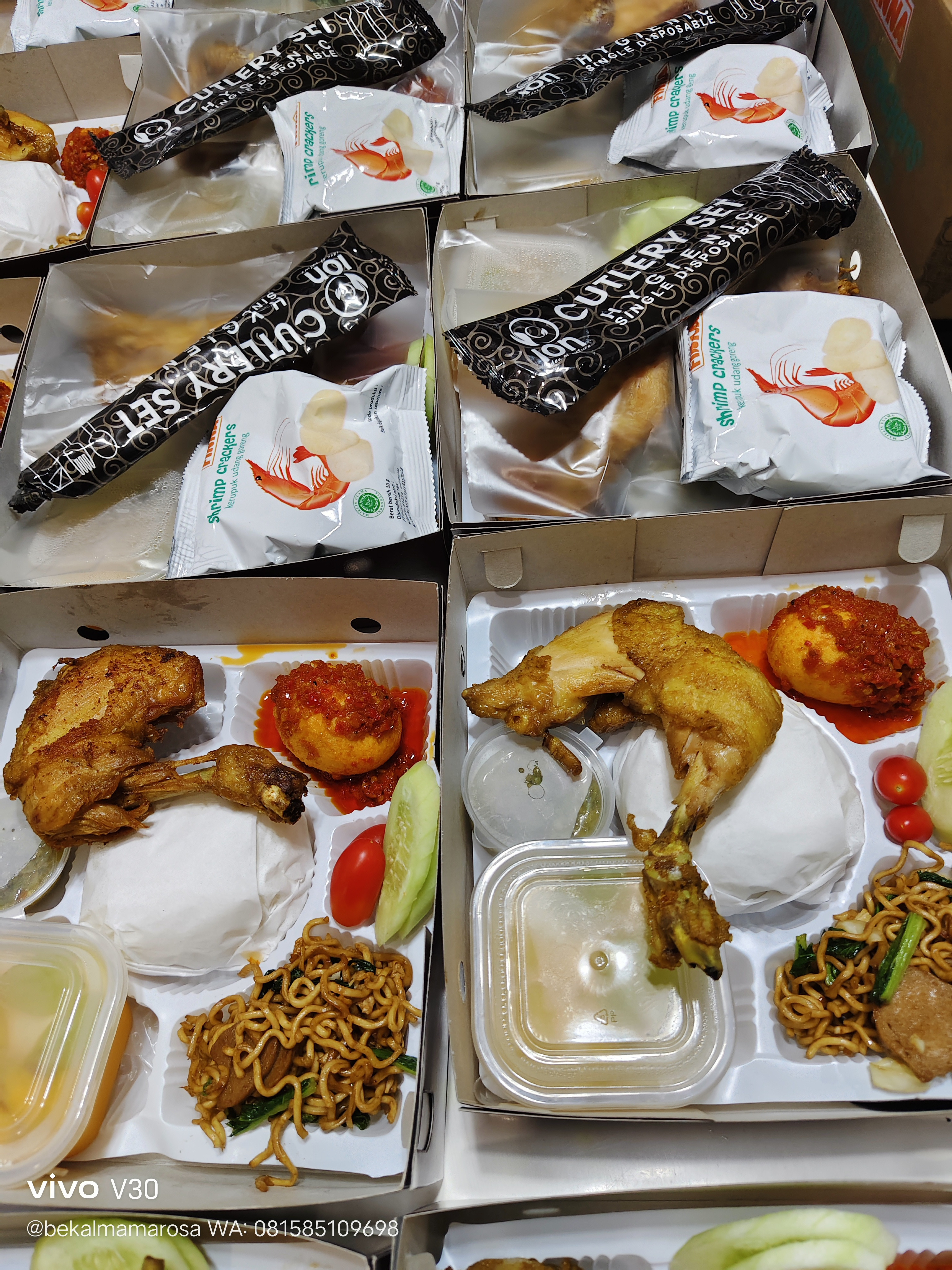 Paket Nasi 35.000 : 1. Ayam Goreng 1/4 ekor 2. Telor Balado 3. Lalapan + Sambal 4. Mie Goreng 5. Puding 6. Krupuk Udang