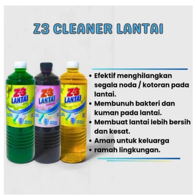 Z3 Cleaner Lantai adalah Sabun Pembersih Lantai dengan Antibacterial yang dapat membersihkan kotoran dan kuman dilantai secara menyeluruh. Volume : 1000 ML 1. Mengangkat kotoran, noda, dan kuman pada lantai 2. Mambuat Lantai lebih bersih dan mengkilap 3. Lantai menjadi lebih kesat Z3 Cleaner Lantai sampai saat ini mempunyai 3 variasi harum : 1. Harum Lavender, harum yang menjauhkan dari serangga. 2. Harum Lemon, harum yang menyegarkan dan membuat fresh tubuh 3. Harum Apel, harum harum yang soft cocok untuk berkumpul bersama keluarga Z3 adalah Produk Baru segala solusi untuk Kebersihan dan Perawatan Peralatan Rumah Tangga, Pakaian, dan Kendaraan anda, kami siap bersaing dengan kualitas terbaik dan harga yang terjangkau. kami siap menerima saran dari customer untuk mengembangkan produk kami. harapan kami produk kami menjadi unggulan solusi untuk segala Kebersihan dan Perawatan Peralatan Rumah Tangga, Pakaian, dan Kendaraan. Selamat berbelanja :)
